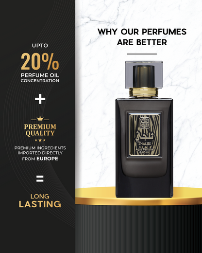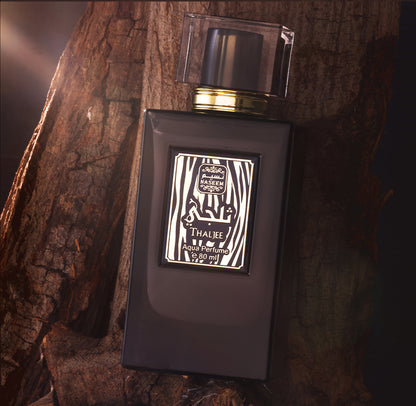 A fragrance that is harsh yet very seductive, radiating an animalistic warmth that opens the fragrance. A somber night reflected in the deep oud and woody aromas. The creamy sandalwood, vanilla, and tonka coalesce into one, creating an exceptional oriental composition. A majestic compilation; Thaljee exudes the power, valor, and sexiness of the wild through fragrance.
