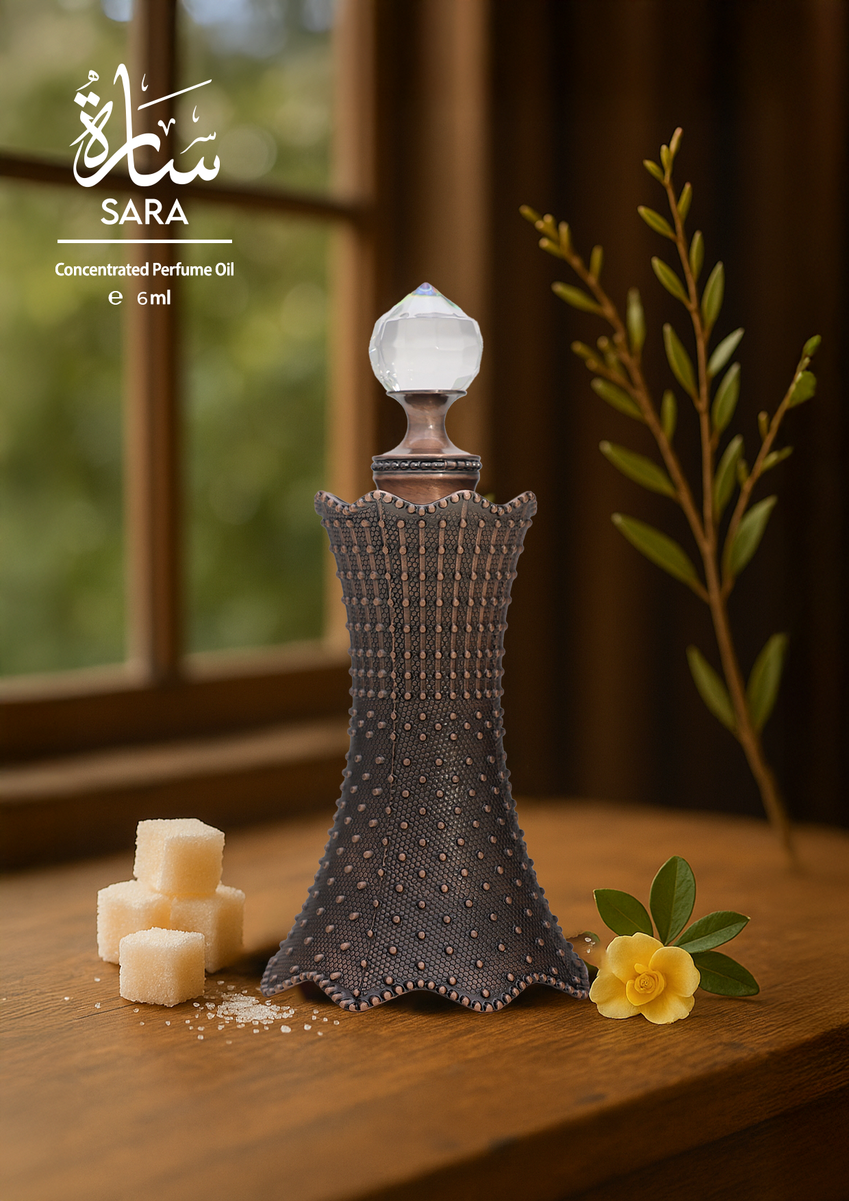 Sara Attar is a captivating woody-ambary-musky fragrance that opens with sweet sugar and the unique, slightly floral note of targeted, offering a bright and intriguing start.
