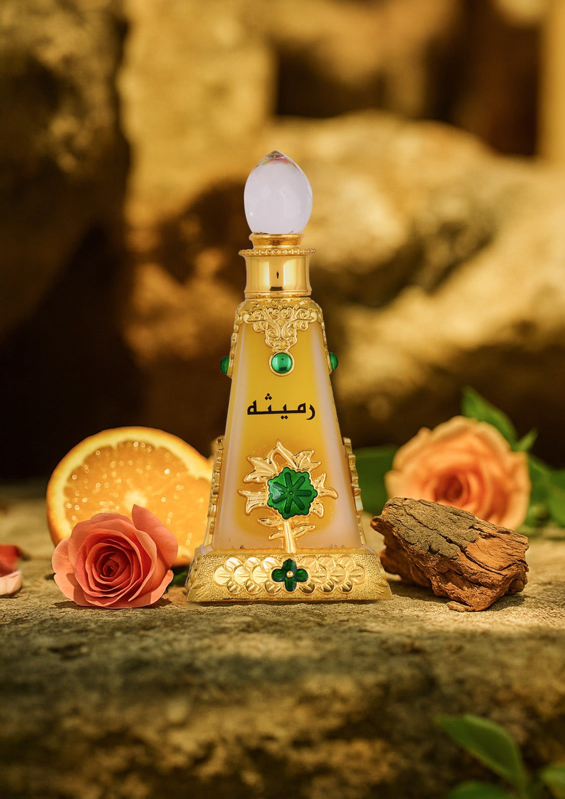 A warm and sophisticated fragrance that opens with the exotic spice of saffron and clove, brightened by bergamot and orange. At its heart, a lush floral bouquet of rose, jasmine, and heliotrope is sweetened by juicy peach. The scent settles into a rich, sensual base of cedarwood, amber, musk, patchouli, and creamy vanilla. Elegant, opulent, and unforgettable.